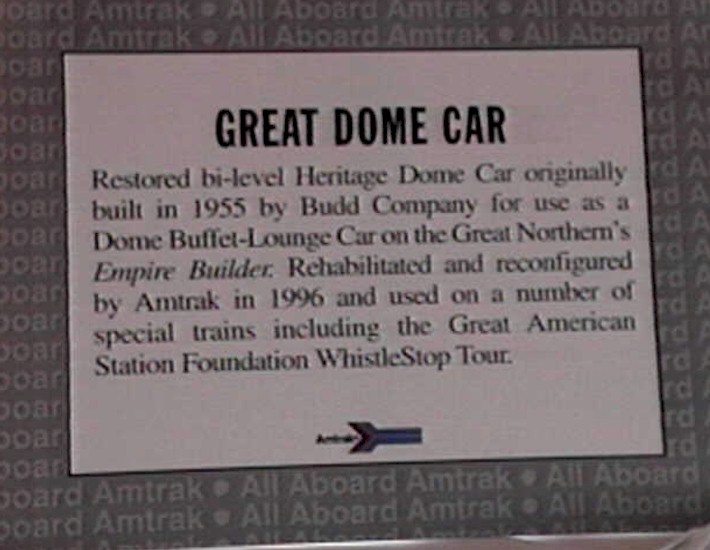 Amtrak did decided to repair the trucks on one Great Dome. It retained "Ocean View", which by default, became the railroad's last remaining dome car. Amtrak's new logo was added, along with a special panel that reflected it's 'Ocean View' name in the same font used by the Great Northern.