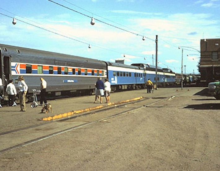 The re-painting took time; this photo of the Empire Builder in Havre, MT (taken in September 1972) still shows one of the Great Domes in its Great Northern colors.