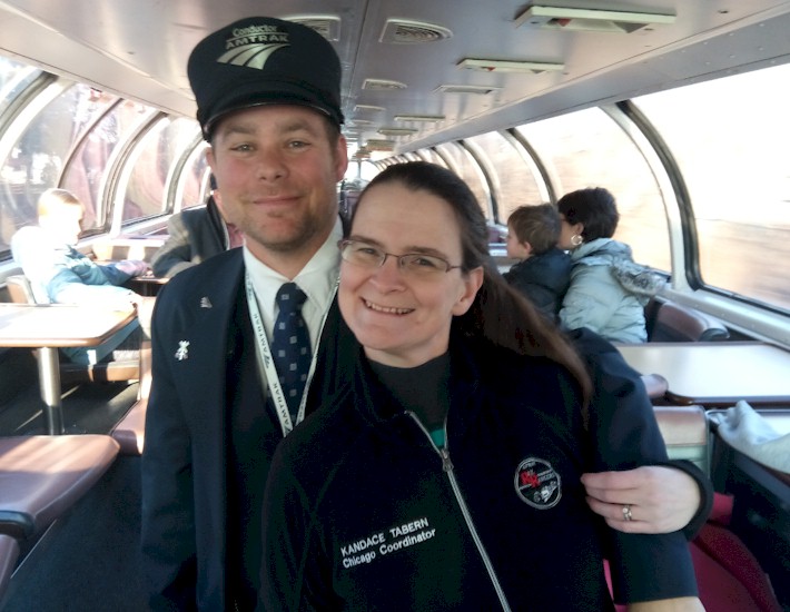 Co-author Kandace Tabern poses with our friend, Conductor Ben, on the 'Ocean View' Great Dome when it was running on the Hiawatha in November 2017.