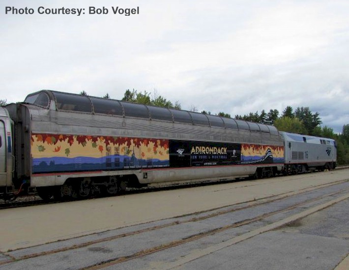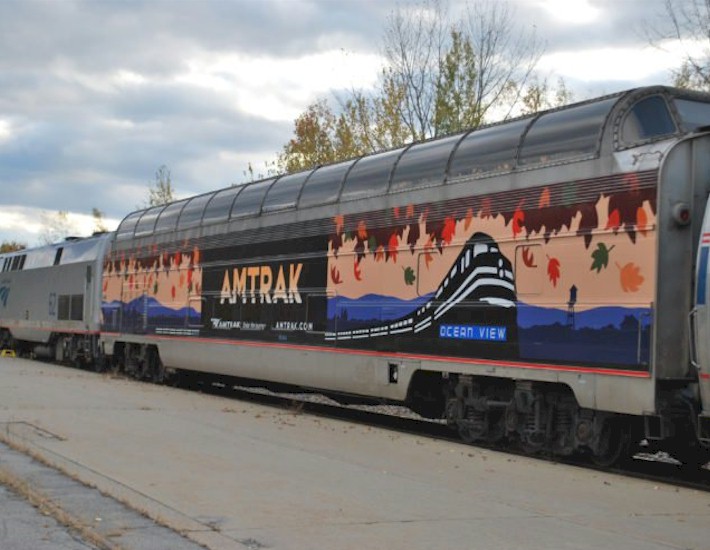 "Ocean View" received a lot of attention, especially among railroad enthusiasts over the past decade, as dome cars and heritage railcars from the pre-Amtrak era seemed to slip more into people's memories. Amtrak seemed to recognize this fact and realize the significance of it only having one dome car remaining in the fleet. Between 2010 and 2012, "Ocean View" operated for very limited two-week run on the Cardinal between Chicago and Washington, DC. It also has become a very popular staple during the fall leaf-peeping season on the Adirondack between Albany, New York and Montreal, Quebec... plus on the Downeaster between Boston and Brunswick, Maine. "Ocean View" also made appearances on most of the Midwestern routes during the mid-2010's, too, including operating as extra seating on the Hiawatha between Chicago and Milwaukee during the busy Thanksgiving travel week. 'Ocean View' received a special "fall colors" wrap in 2010, and was then re-painted in Amtrak's 'Phase III' retro 1980's paint scheme in 2011 to celebrate the railroad's 40th Anniversary. It has remained in this style ever since.