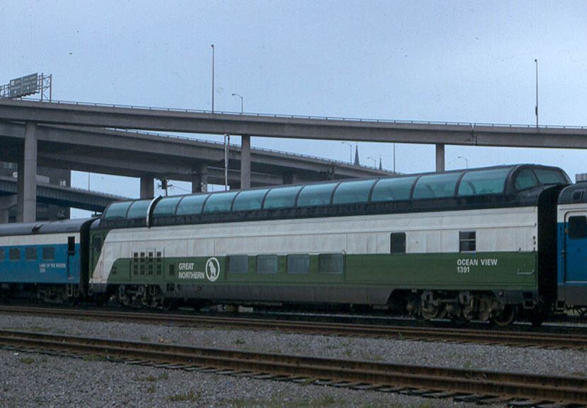 In anticipation of its merger into the Burlington, the Great Northern tried out an experimental paint scheme in 1969 on Great Dome 'Ocean View'. As pictured above, the dome had a white stripe straight through the car -- making a half green lower (that particular shade of green was the new color for the Burlington Northern), a half white upper, a black roof, but still Great Northern Big Sky Blue style lettering and logos. This was the only Great Dome car painted by the soon-to-be Burlington Northern.
