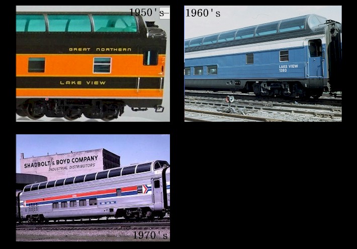 Great Dome car "Lake View" was built for the Great Northern Railroad in 1955, and was originally given GN Car #1393. For the 15 years it was part of the Great Northern, this car was mainly used on the Empire Builder line between Chicago and the Pacific Northwest. In the late 1960's, it was re-painted in the Great Northern's new blue paint scheme. When the Great Northern was merged with other railroads in 1970 to form the Burlington Northern, the ownership of this car was transferred. The Burlington Northern continued to run this Great Dome on its Empire Builder train. Just about a year later, ownership was transferred to Amtrak, when it took over most of the Burlington's passenger train service in May 1971. This car was re-numbered as Amtrak Car #9363. It remained in service on the Empire Builder under Amtrak, too, until being replaced by bi-level Superliner equipment in October 1979. Amtrak retired "Lake View" in February 1982. The following year it was sold to the Southern Pacific Railway, who scrapped it at their Oakland, California yards. Luckily, of the six original Great Dome cars, this is the only one not to be in existence.
