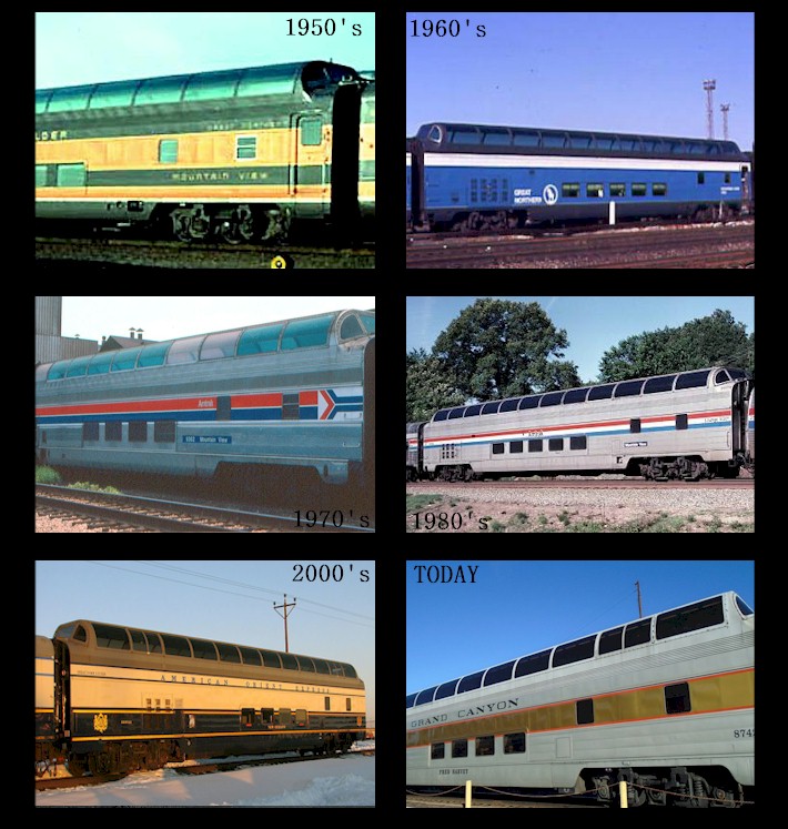 Great Dome car "Mountain View" was built for the Great Northern Railroad in 1955, and was originally given GN Car #1392. For the 15 years it was part of the Great Northern, this car was mainly used on the Empire Builder line between Chicago and the Pacific Northwest. In the late 1960's, it was re-painted in the Great Northern's new blue paint scheme. When the Great Northern was merged with other railroads in 1970 to form the Burlington Northern, the ownership of this car was transferred. The Burlington Northern continued to run this Great Dome on its Empire Builder train. Just about a year later, ownership was transferred to Amtrak, when it took over most of the Burlington's passenger train service in May 1971. This car was re-numbered as Amtrak Car #9362. It remained in service on the Empire Builder under Amtrak, too, until being replaced by bi-level Superliner equipment in October 1979. After going through head-end power upgrades in March 1985, it was re-numbered as Amtrak Car #9301. Great Dome "Mountain View" was assigned to the route of Amtrak's Auto Train between 1985 and 1995. It went through additional upgrades in 1996 and 1999, and was re-numbered as Amtrak Car #10030 when it was added to Amtrak's special services unit. The Grand Luxe then acquired the car from Amtrak in September 2001 and renamed it "New Orleans" for service on the American Orient Express. In 2009, it was purchased by Xanterra's Grand Canyon Railway, refurbished, and entered service as "Fred Harvey" in September 2012. You can still ride it in Arizona to the South Rim of the Grand Canyon.
