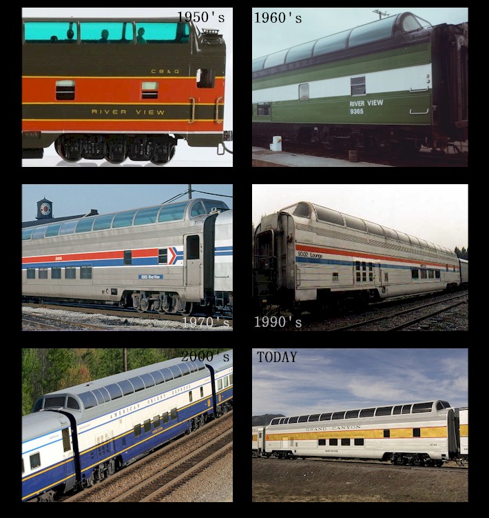 Great Dome car "River View" was built for the Chicago, Burlington & Quincy Railroad in 1955, and was originally given CB&Q Car #1395. This was the only Great Dome that was owned by the CB&Q through an agreement with the Great Northern. For the 15 years it was part of the CB&Q, this car was mainly used on the Empire Builder line between Chicago and the Pacific Northwest. In the late 1960's, it was re-painted in the Great Northern's new blue paint scheme. When the CB&Q was merged with other railroads in 1970 to form the Burlington Northern, the ownership of this car was transferred. The Burlington Northern continued to run this Great Dome on its Empire Builder train. Just about a year later, ownership was transferred to Amtrak, when it took over most of the Burlington's passenger train service in May 1971. This car was re-numbered as Amtrak Car #9365. It remained in service on the Empire Builder under Amtrak, too, until being replaced by bi-level Superliner equipment in October 1979. After going through head-end power upgrades in March 1985, it was re-numbered as Amtrak Car #9302. Great Dome "River View" was assigned to the route of Amtrak's Auto Train between 1985 and 1995. It went through additional upgrades in 1996 and 1999, and was re-numbered as Amtrak Car #10032 when it was added to Amtrak's special services unit. The Grand Luxe then acquired the car from Amtrak in September 2001 and renamed it "Copper Canyon" for service on the American Orient Express. In 2009, it was purchased by Xanterra's Grand Canyon Railway. GCR re-named this car "Mary Colter" in honor of the Harvey Company's chief architect, responsible for the design of many historic buildings at Grand Canyon National Park.