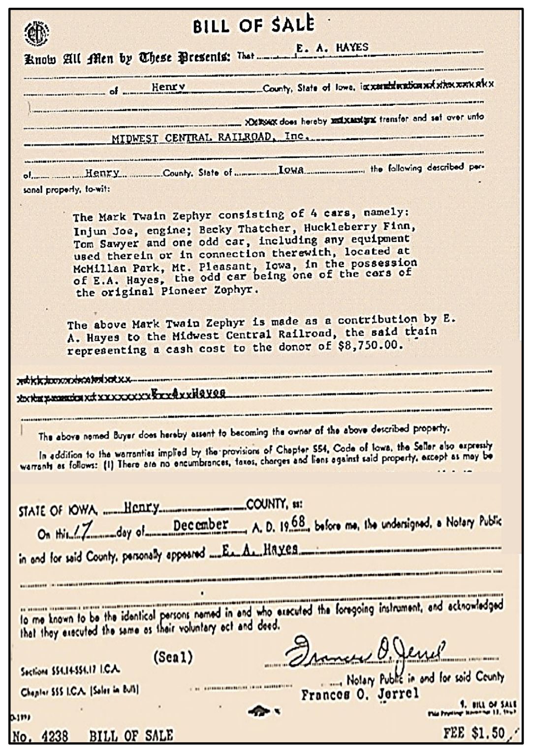 By 1968, Ernie Hayes was becoming more occupied with his insurance agency and other business interests. After six-and-a-half years of owning the Mark Twain Zephyr, he decided to officially donate it to the Midwest Central Railroad, which had been storing it for him. Hayes hoped the formal donation of the train would spur its restoration by Midwest Central. The railroad already operated narrow gauge steam train rides around the grounds of the Midwest Old Settlers & Thresher Association in Mount Pleasant. The Midwest Central Railroad, with Stan Mathews as President, officially became the third private owner of the Mark Twain Zephyr on December 17, 1968.