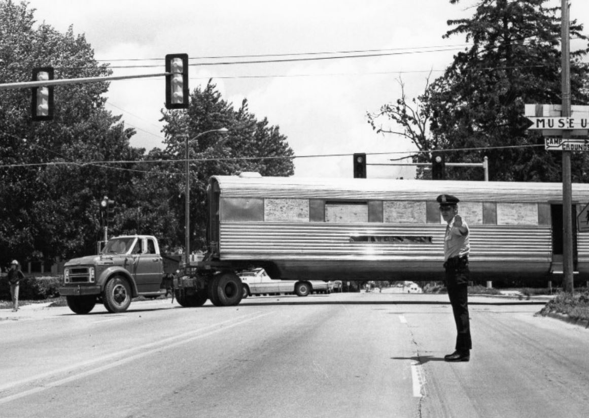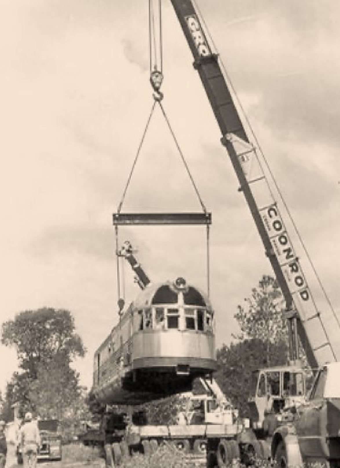 In July 1979, Gerald "Skeeter" Hidy, a resident of nearby Batavia, Iowa, was contracted by the Old Threshers and Barket to move the train cars from McMillan Park to the railroad siding along the Burlington Northern in Mount Pleasant, Iowa. Hidy recalls the original plan was to then put the cars of the Mark Twain Zephyr back on the rails at Mount Pleasant and move them to Kansas City under its own power. However, that plan was nixed by the BN at the last minute. The railroad changed its mind and required the train to be transported on flat cars pulled by a freight locomotive. Virgil E. Coonrod of Cedar Rapids, Iowa, who owned a crane business, did the work of lifting the cars before they departed Mount Pleasant for good.