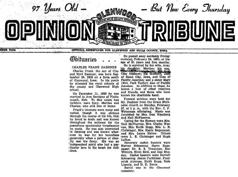 March 2, 1961 edition of the Glenwood Opinion Tribune featuring Dashner's obit