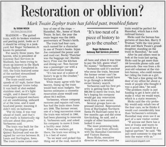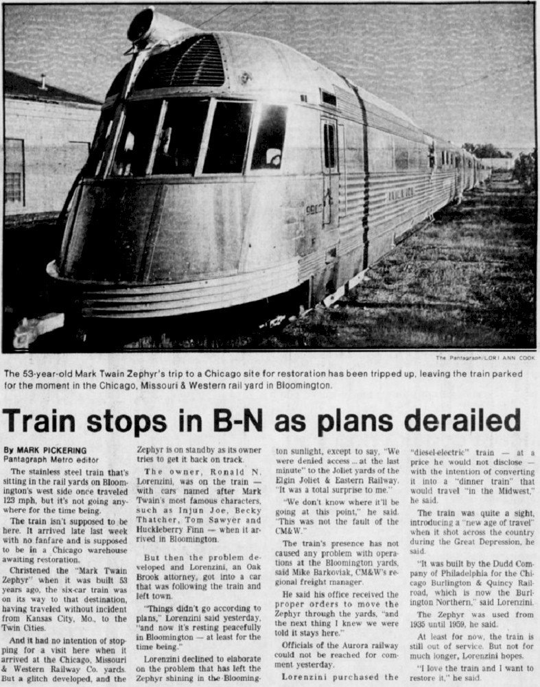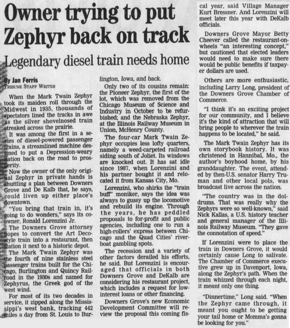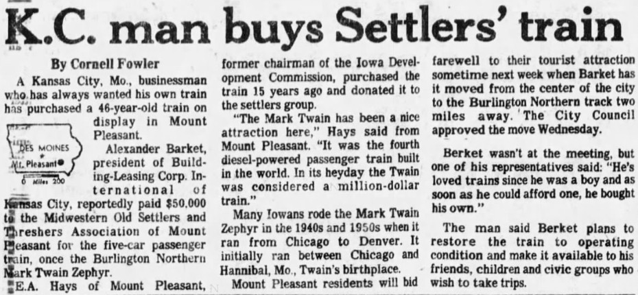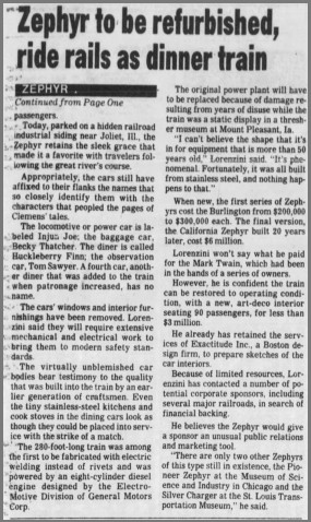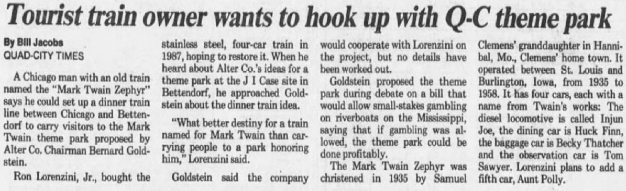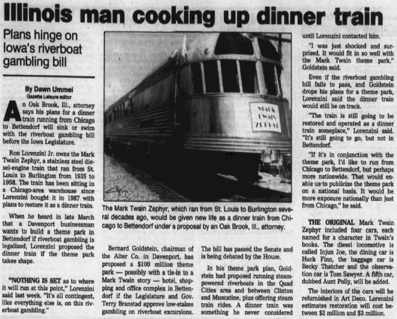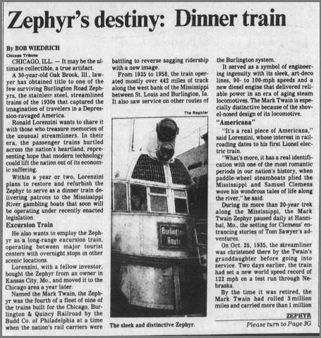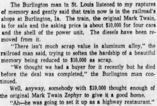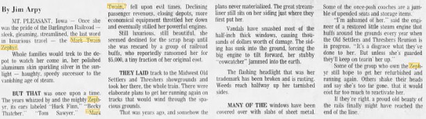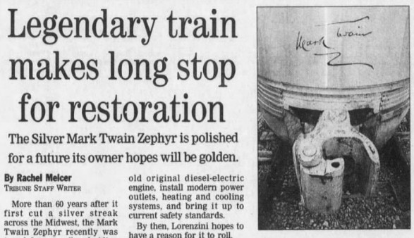 A 1971 newspaper article drew attention to the historic Mark Twain Zephyr