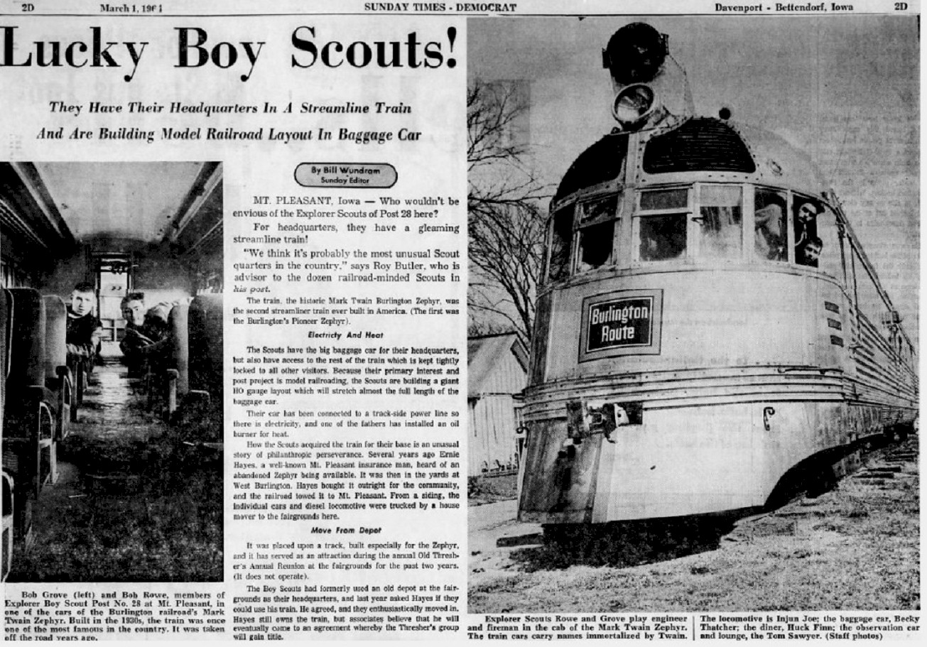 The March 1, 1964 edition of the Quad-City Times details a Boy Scout group who was allowed to use the Mark Twain Zephyr to build a model railroad layout. (Courtesy: Quad-City Times)