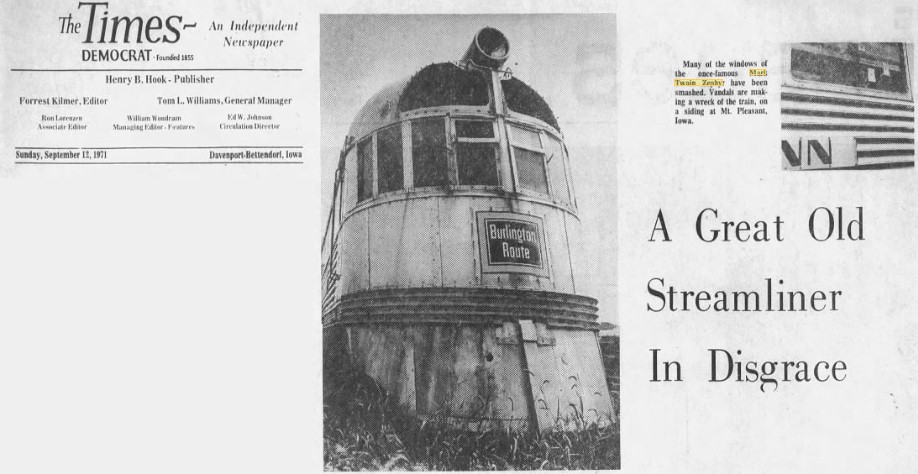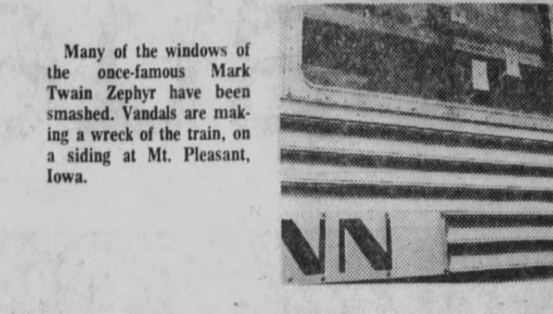 On September 12, 1971, Jim Arpy, a reporter for the Quad Cities Times Democrat, wrote a scathing front-page newspaper article entitled "A Great Old Streamliner in Disgrace". It detailed the very poor condition that the Midwest Central Railroad let the Mark Twain Zephyr get into during the nine years it had been on their property.