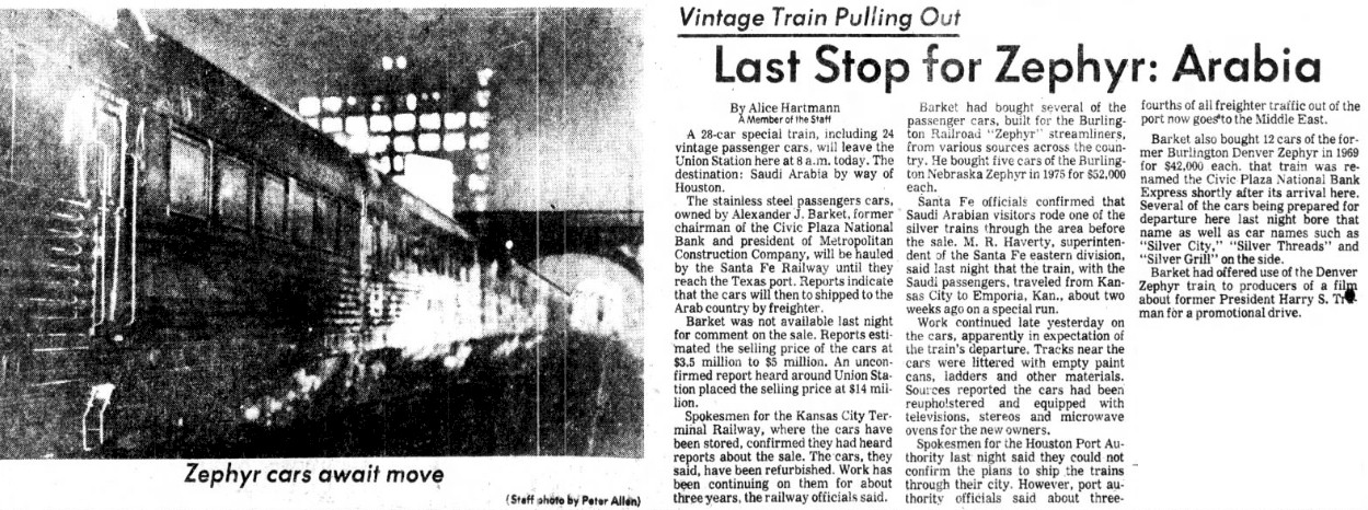 In addition to the Texas Zephyr, Barket also purchased five cars from the former CB&Q "Train of the Gods" Nebraska Zephyr train set in 1975 for $52,000 each. The cars featured names such as "Apollo", "Mars", "Neptune", "Cupid", "Vulcan", "Mercury", and "Jupiter". (Yes, this was the sister train set of the former CB&Q "Train of the Goddesses" Nebraska Zephyr, which has been operating at the Illinois Railroad Museum since the late 1960's!). Barket also purchased six cars of a sister Denver Zephyr (he was not able to get the complete train set for this train because several cars were owned by another individual in South Dakota).