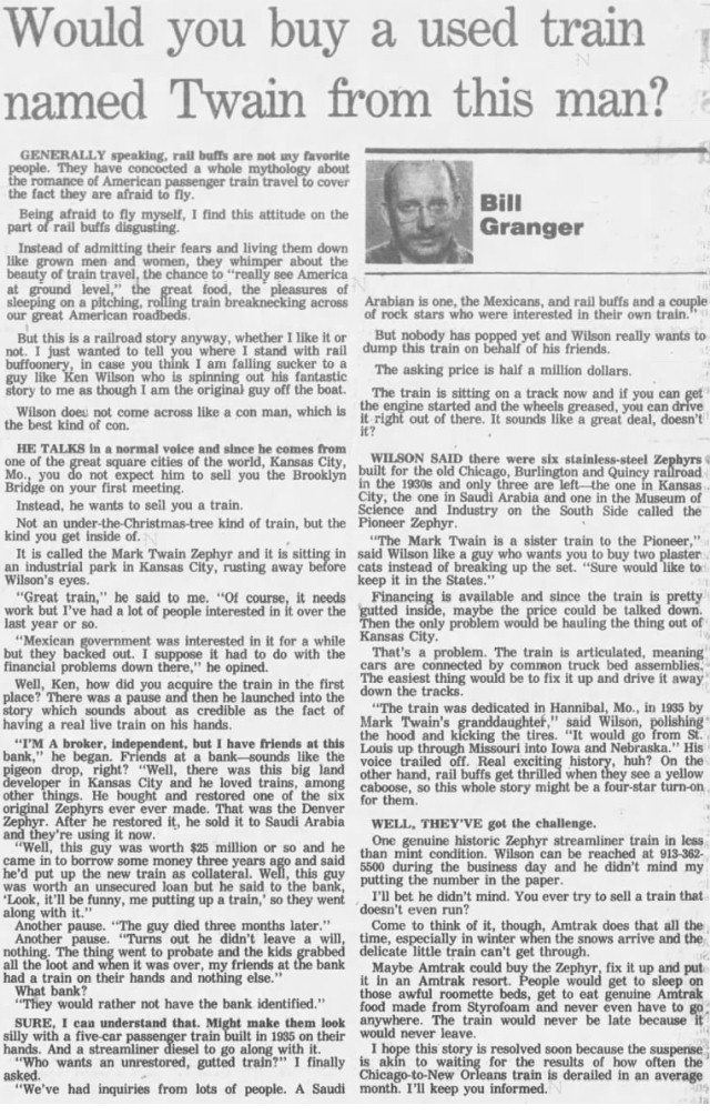Ken Wilson also reached out to several newspapers and business journals across the country in an effort to find a new buyer for the Mark Twain Zephyr. One of the more interesting articles is below, written by Bill Granger with the Chicago Tribune, published on February 1, 1983.