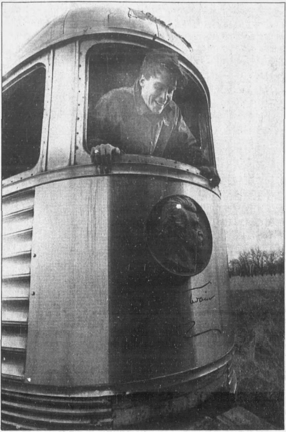 A portion of the article reads, "The great streamliner still sits on her side just where they first put her. Vandals have smashed out most of the half-inch thick windows, causing thousands of dollars' worth of damage. The siding (which the Mark Twain Zephyr had been parked on) has sunk into the ground, forcing the big engine to tilt forward, her stubby "cowcatcher" jammed into the earth. The flashing headlight that was her trademark has been broken and is rusting. Weeds reach halfway up her tarnished sides. Many of the windows have been covered up with sheet metal. Some of the once-posh coaches are a jumble of upended seats and storage items."