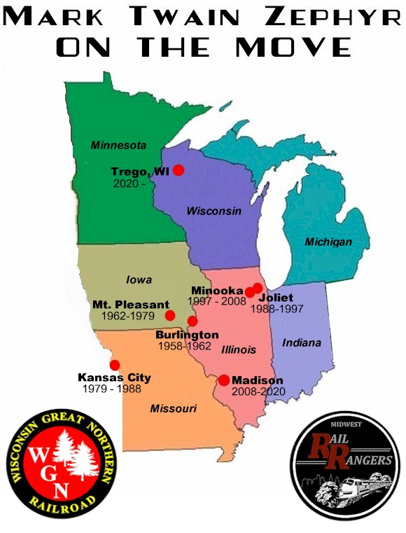 This article is (c)2022 Wisconsin Great Northern Railroad and the Midwest Rail Rangers, a 501(c)(3) non-profit historical partner. No part of the materials available through the www.MarkTwainZephyr.com and www.ZephyrHistory.com sites may be copied, photocopied, reproduced, translated or reduced to any electronic medium or machine-readable form, in whole or in part, without prior written consent of the above parties. Historic information: MRRC / P.O. Box 184 / Barron, WI 54812 / info@railrangers.org