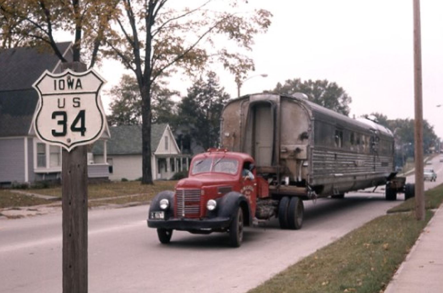 Shortly after his purchase, Hayes moved the Mark Twain Zephyr from the CB&Q Yards in West Burlington, Iowa to the Midwest Old Settlers & Thresher Association grounds in Mount Pleasant, Iowa... a distance of about 27 miles. A newspaper report from the time indicates that a house moving company was used to get the Mark Twain Zephyr from the Burlington main line in Mount Pleasant over to the museum grounds.
