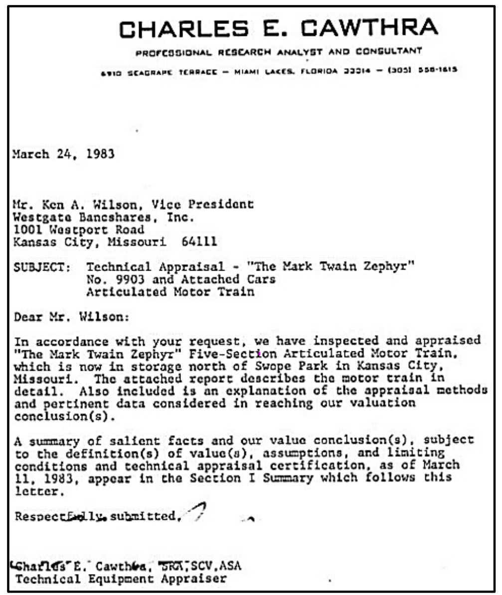 In order to know the value of the Mark Twain Zephyr, Ken Wilson recalls that Westgate Bancshares commissioned an in-depth appraisal report on the train, conducted by technical equipment appraiser Charles E. Cawthra. The report released in March 1983 valued the Mark Twain Zephyr at $600,000 "as-is", but had the value of $6,000,0000 if fully refurbished.