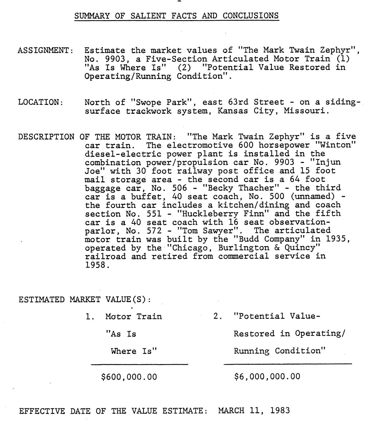 Above are two pages from the 1983 appraisal of the Mark Twain Zephyr.