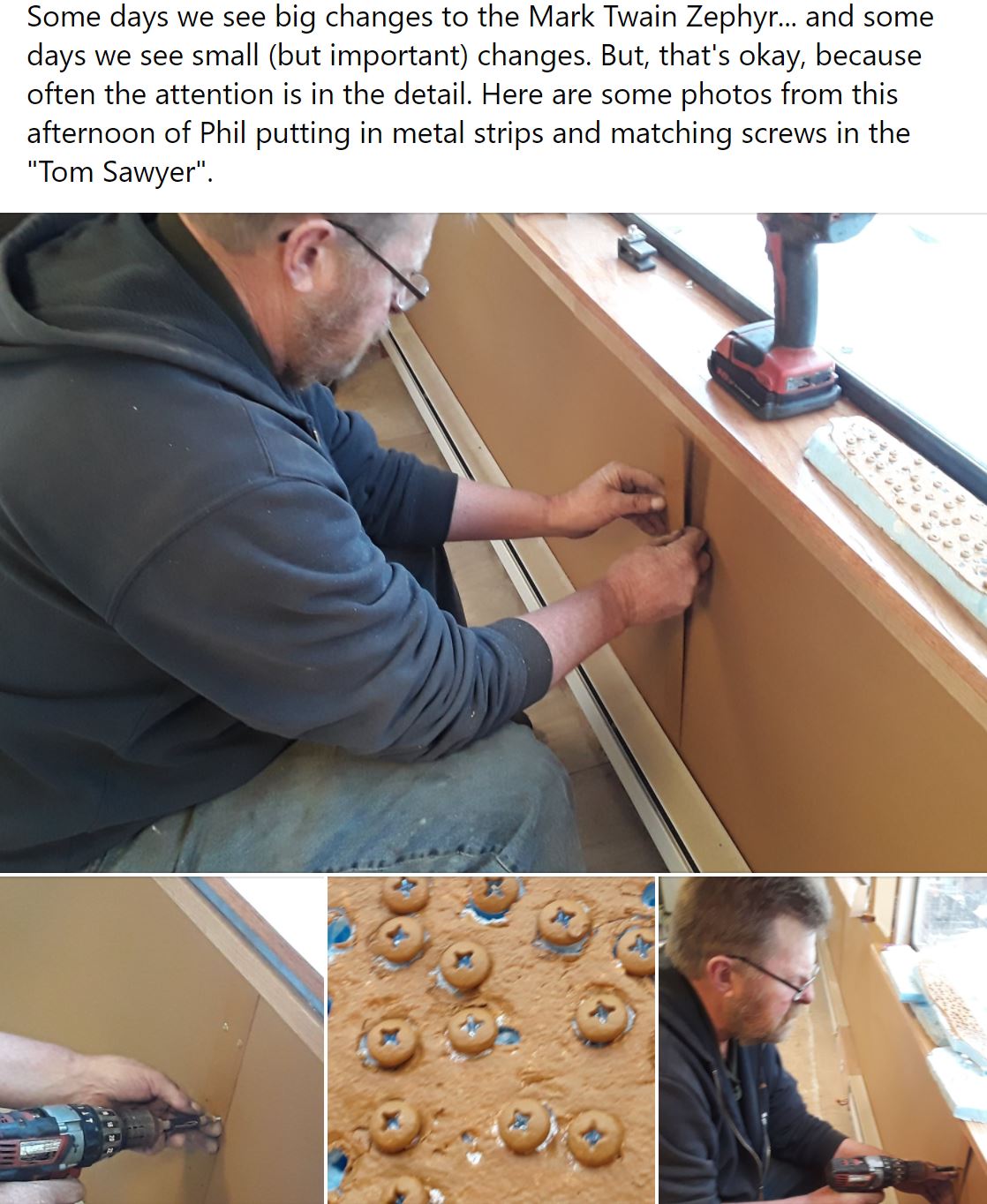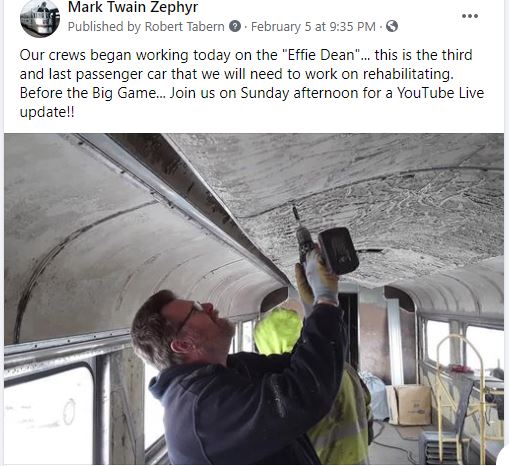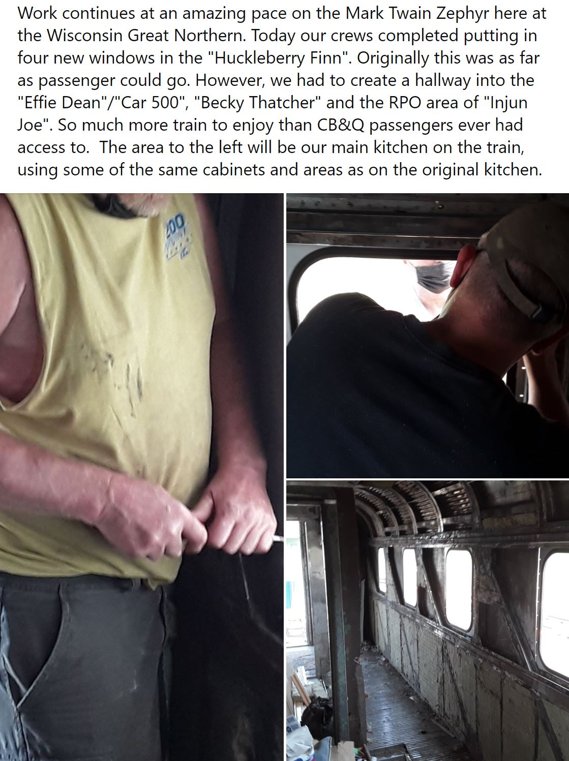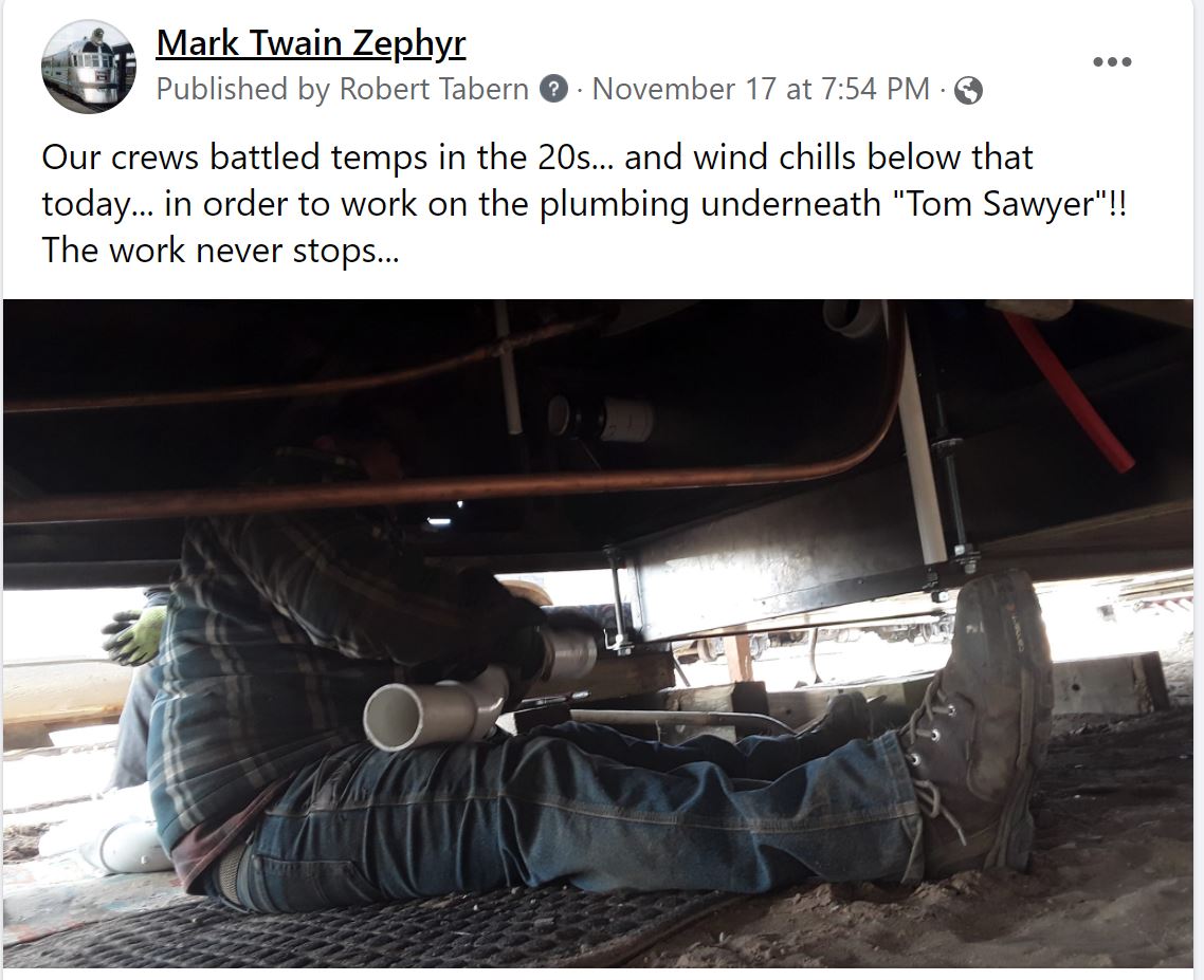 It's another busy week at the WGNRR working on the Mark Twain Zephyr. At the same time we have crews putting in tables now in the "Effie Dean"... welding going on in "Injun Joe"... and heat/air conditioning work going on in the "Becky Thatcher". Phew! We hope you will come and join us SATURDAY (5/29/21) or SUNDAY (5/30/21) for our 2021 MARK TWAIN ZEPHYR OPEN HOUSE ... 10am-4pm CDT