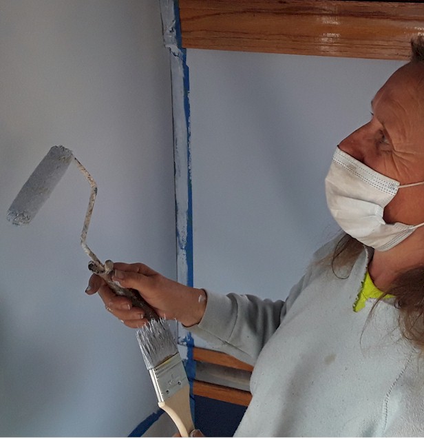 WGNRR Dinner Train Manager Beverly Jaskolski rolls up her sleeves to paint a new wall in the "Huckleberry Finn".