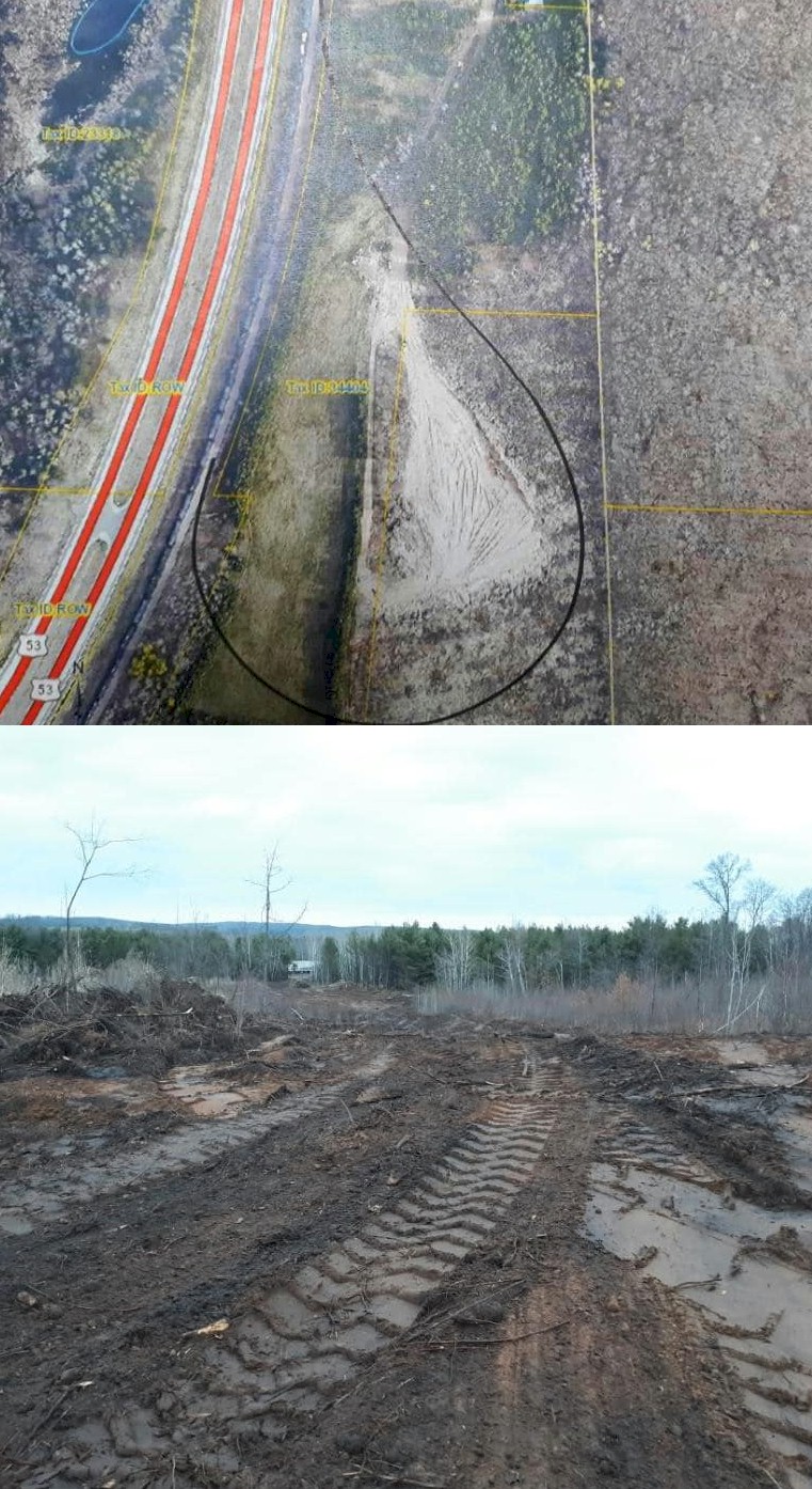 Some more updates on the south turning loop! First photo is an overlay of the rough location of the loop. Dilly Lake road and the Trego Depot and Yard are just north/above this image. The second photos is of the current state of the right of way: cleared and ready for grading.